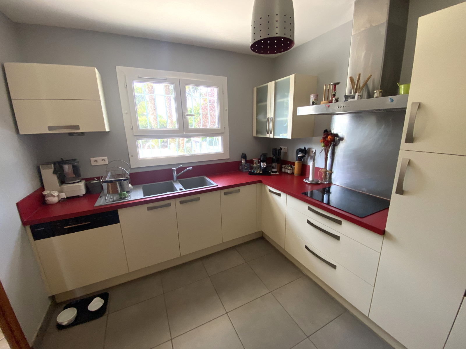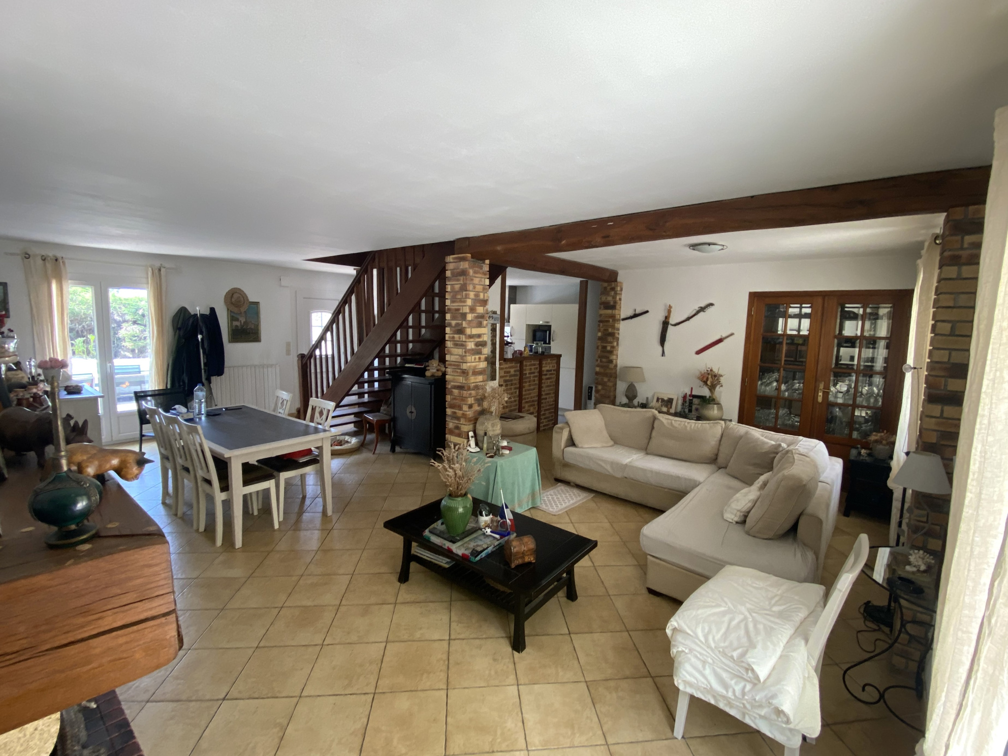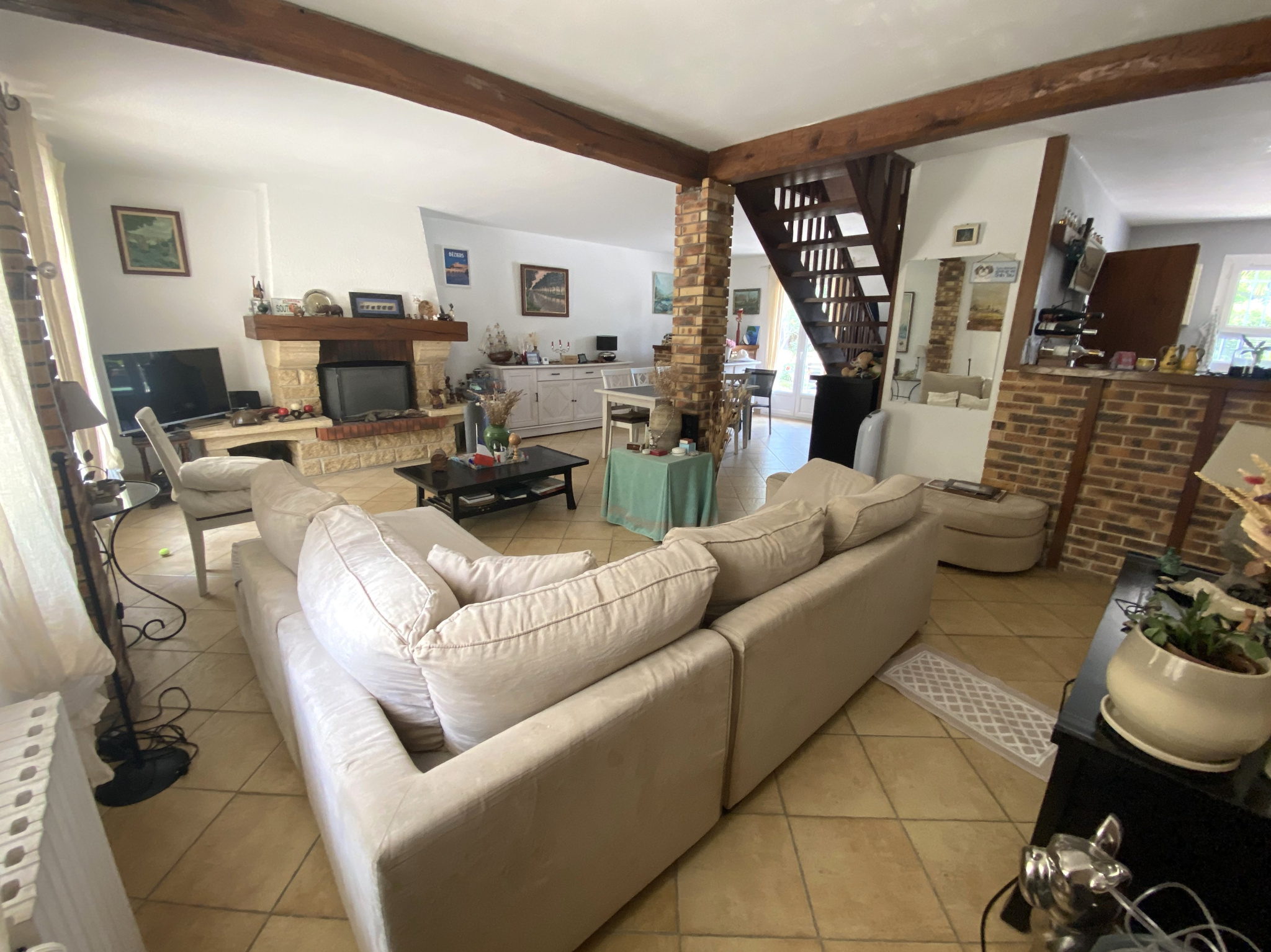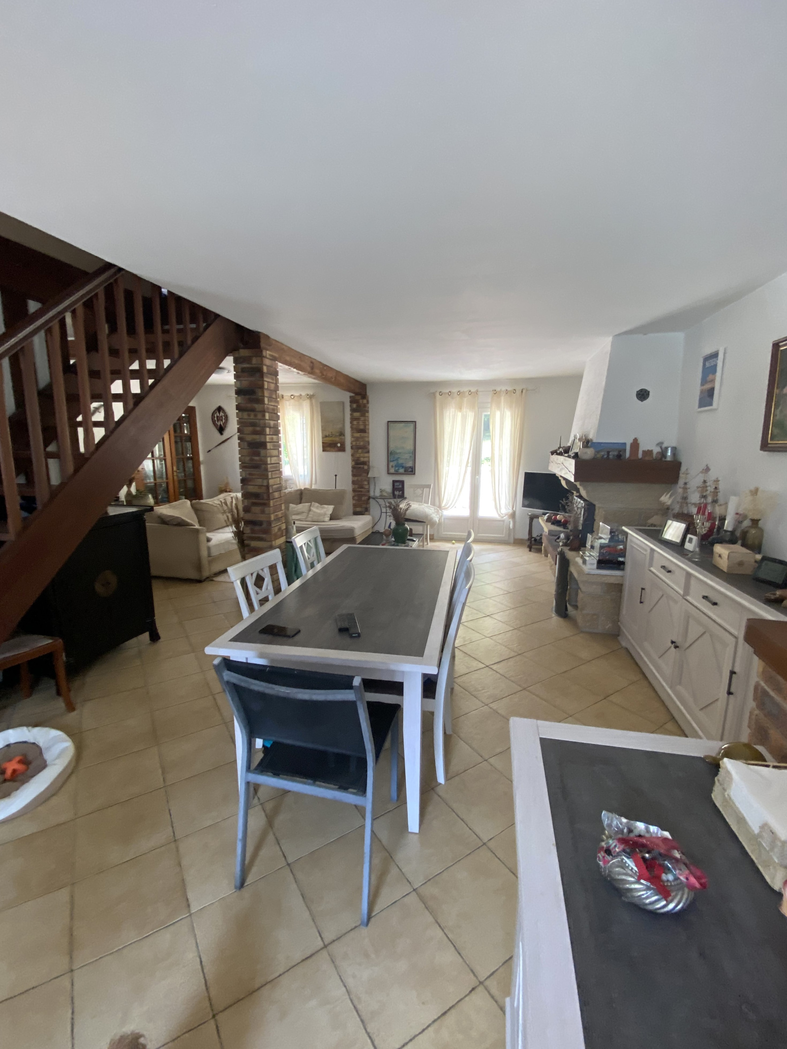 Cheminée ouverte et cuisine équipée Séjour traversant
